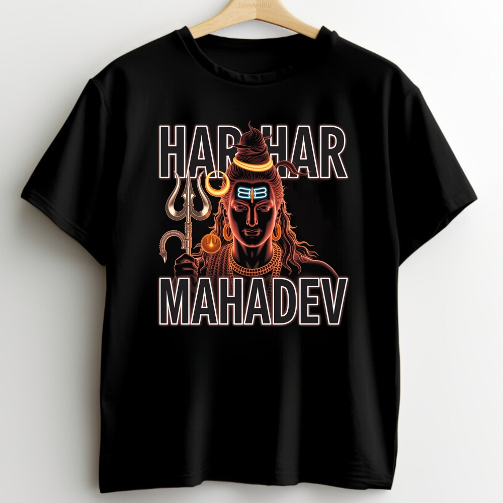 Channel the energy of the destroyer and creator with our exclusive Har Har Mahadev tee. Featuring a powerful portrait of Lord Shiva — the third eye, sacred trishul, and divine glow — this shirt is more than just clothing. It’s a statement of faith, strength, and unshakeable spirit.